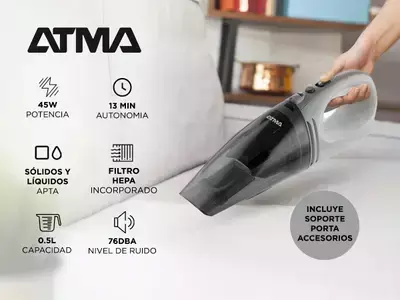 Aspiradora de mano inalámbrica power para polvos y líquidos atma 94as7912pi. Con la aspiradora de mano portable power para polvos y líquidos atma los días de limpieza serán más simples, podés deshacerte del polvo y de los residuos fácilmente y así dejar tus ambientes impecables. Limpia líquidos derramados, suciedad de cajones, interior del automóvil, las butacas y los espacios de guardado, el baúl, aspirá tierra y líquidos que desborda de los platitos de las plantas, aspirá las piedritas que caen por fuera de la litera del gato, teclado de la pc, y muchas cosas más. Portatibilidad que brinda mayor libertad de movimiento: al ser inalámbrica, no tenés que preocuparte por cables ni enchufes, lo que te brinda mayor comodidad y facilita la limpieza en diferentes áreas de tu hogar o incluso en el auto. A prueba de alergias: el sistema de filtrado retiene la suciedad, logrando que el aire que sale del aparato esté totalmente puro y libre de las partículas que producen molestias respiratorias. Mayor versatilidad: la aspiradora de mano es ideal para limpiar lugares de difícil acceso o espacios reducidos, como rincones, escaleras, muebles, cortinas, alfombras y asientos. Su diseño compacto y liviano permite un manejo más sencillo y cómodo.